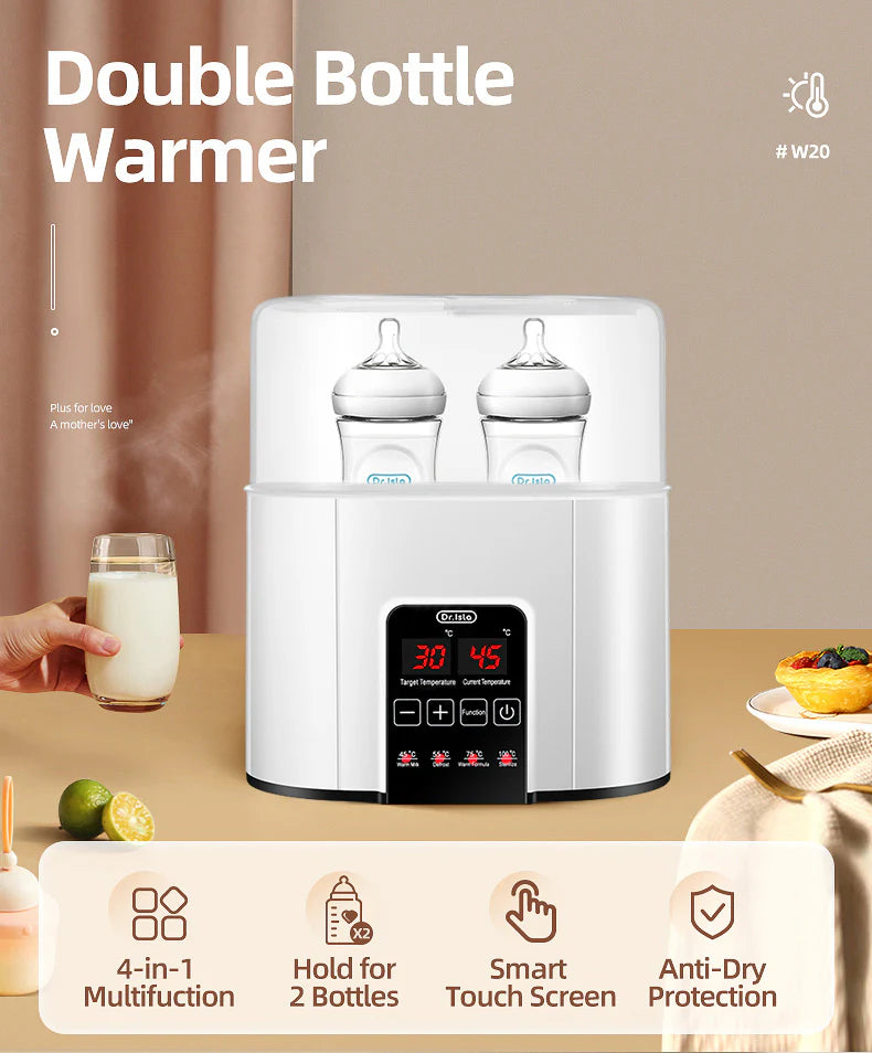 Effortlessly prepare your baby's milk with this 4-in-1 multi-function warmer, designed to safely and quickly warm two bottles at once. Featuring a smart touch screen and anti-dry protection, it’s the perfect blend of care and convenience for every parent.