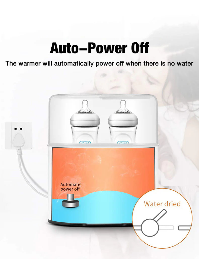 Designed for your family's safety, the warmer automatically shuts off when the water dries out, preventing overheating and ensuring the device is always protected. Enjoy consistent warmth and superior safety, keeping your little one secure and your mind at ease.